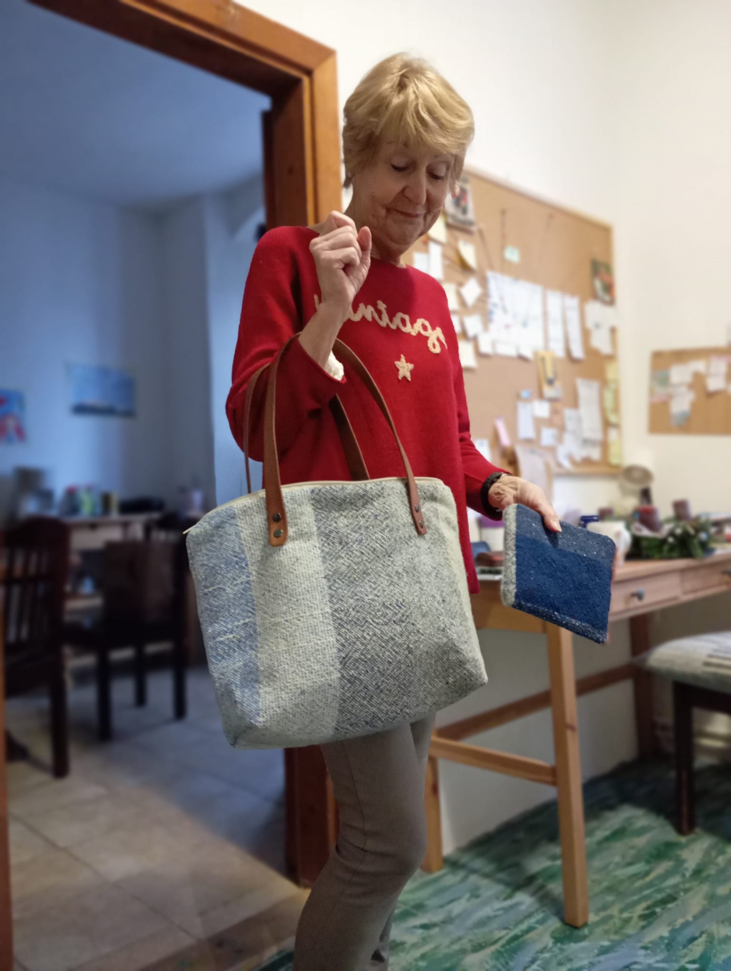 Každá taška bude složena z vámi utkané vlněné látky, povoskované bavlny a kožených popruhů, které připevníme pomocí nýtků.