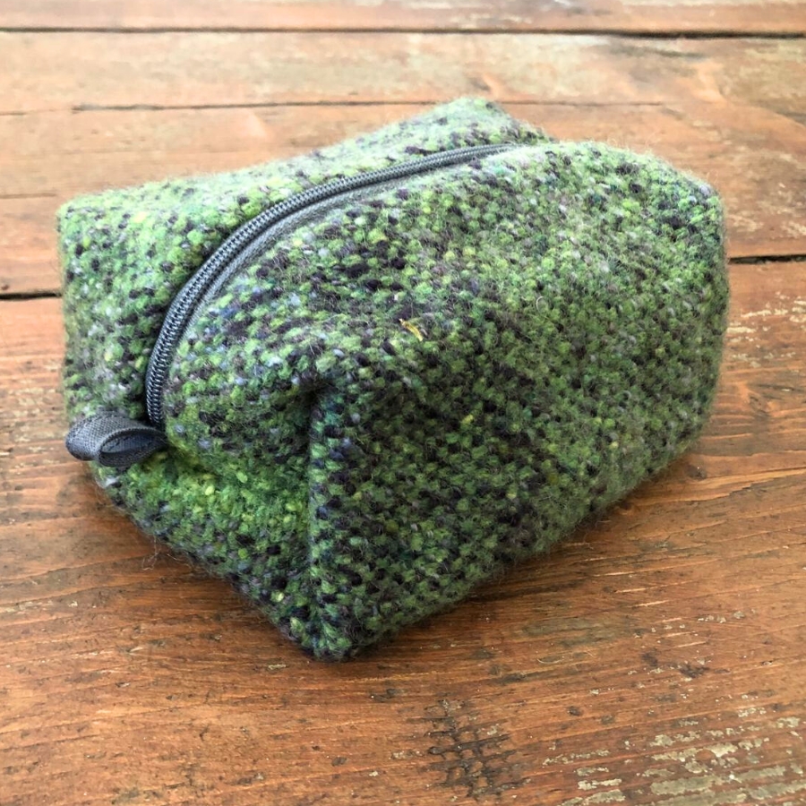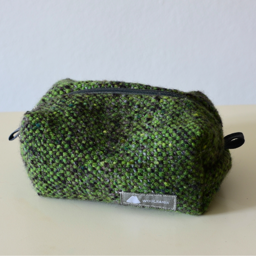 Boxy necesér vyrobený z ručně tkané vlněné látky, má zip a uvnitř bavlněnou podšívku.
