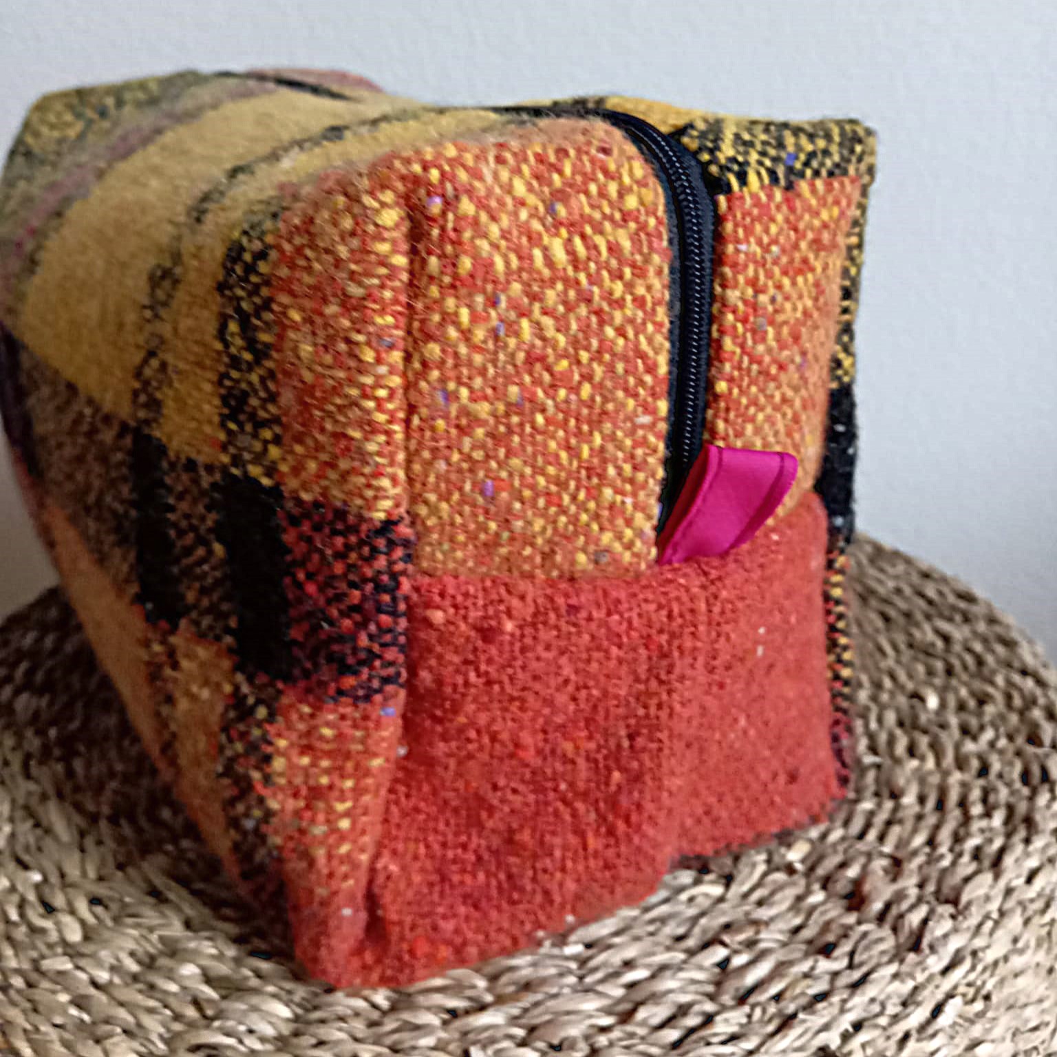 Boxy toiletry bag made of hand-woven woolen fabric, has a zipper and a cotton lining inside.