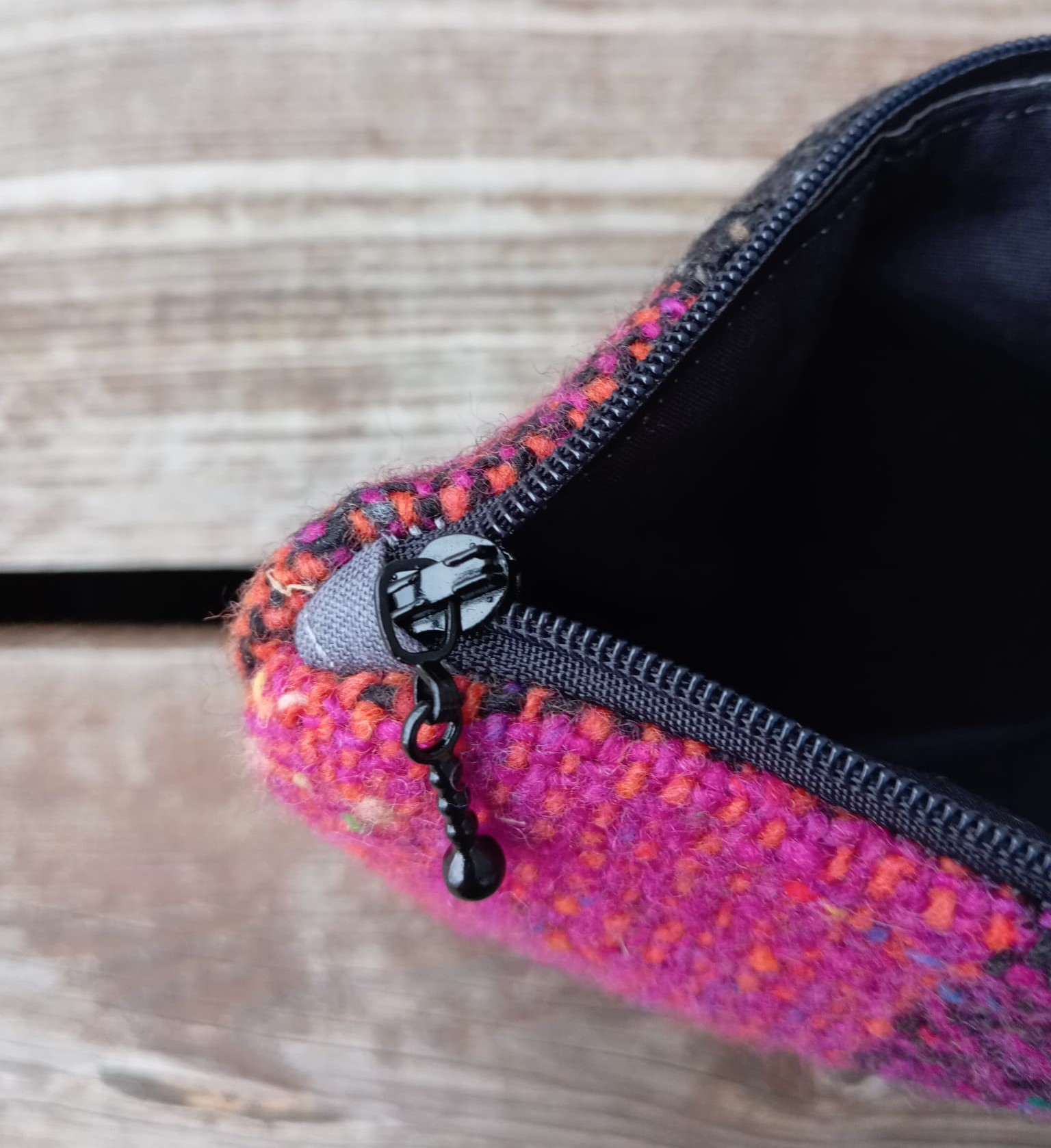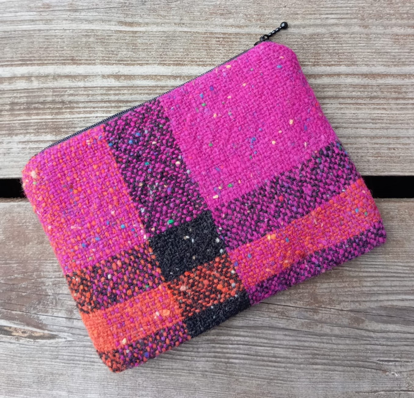 Toiletry bag made of hand-woven woolen fabric, has a zipper and a cotton lining inside.