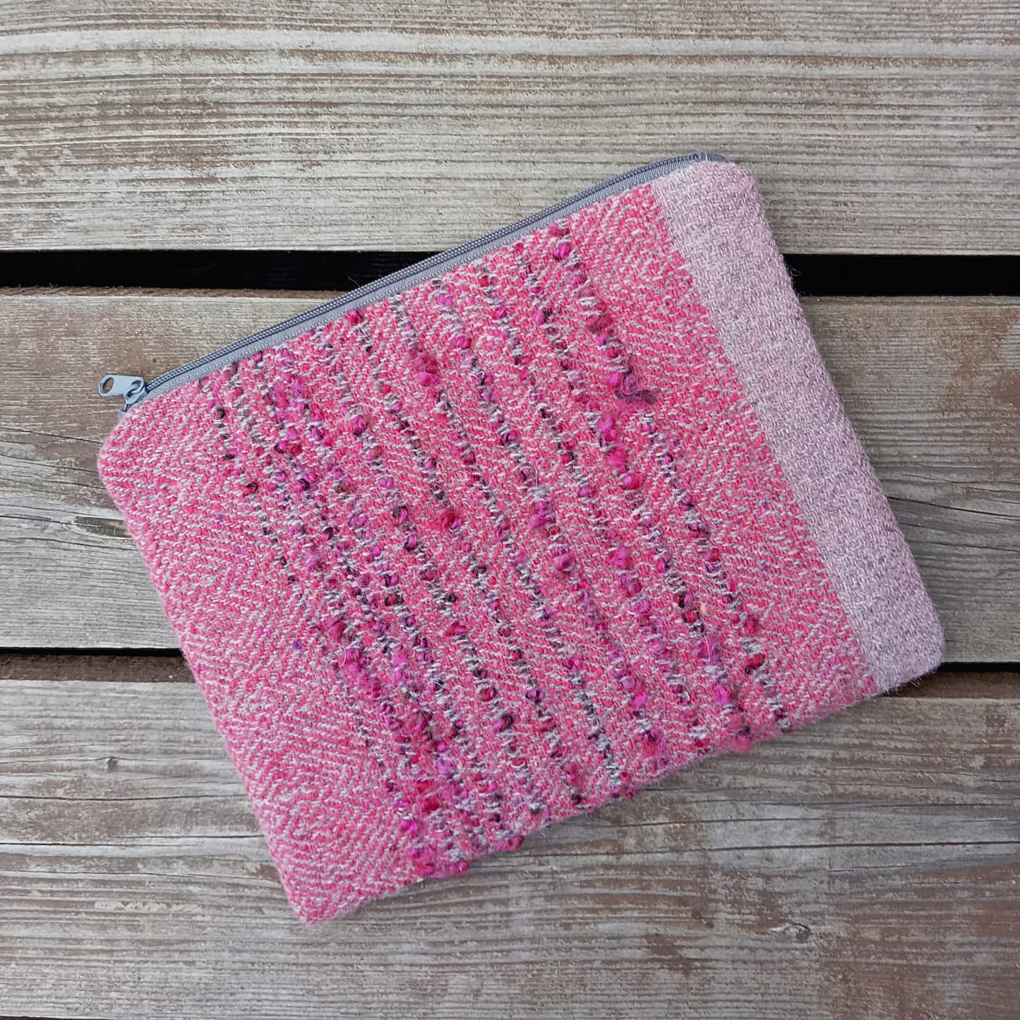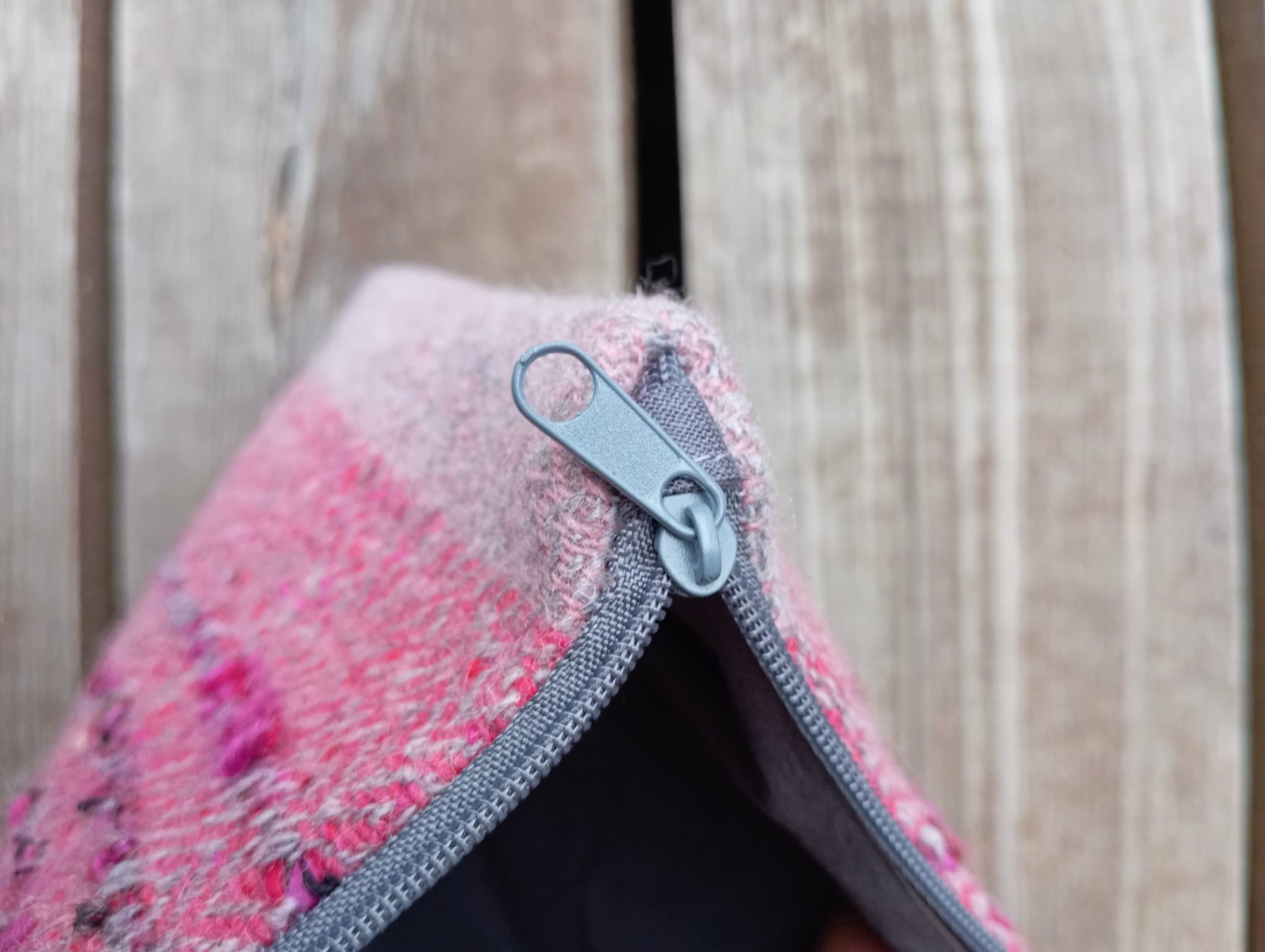 Necesér vyrobený z ručně tkané vlněné látky, má zip a uvnitř bavlněnou podšívku.