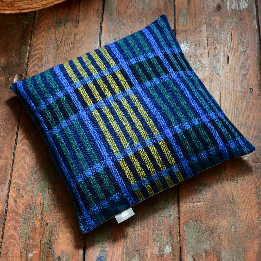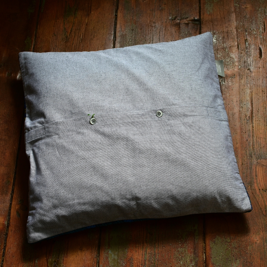 Přední strana polštáře je z ručně tkáné vlněné látky (keprová vazba, 100% merino)
