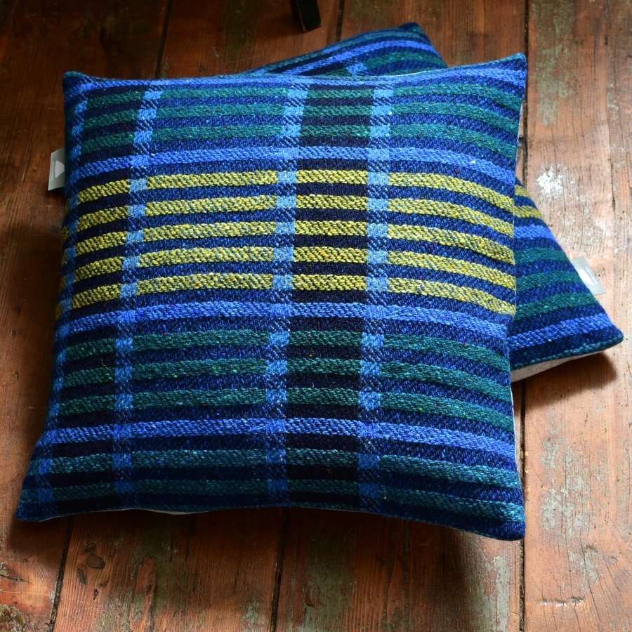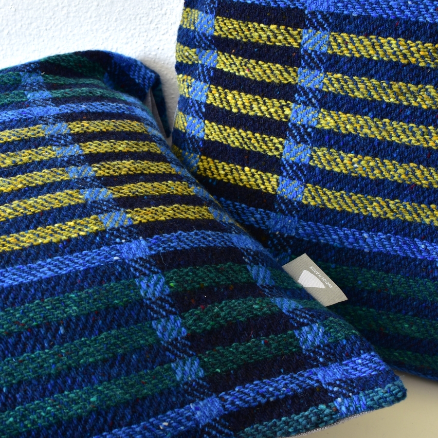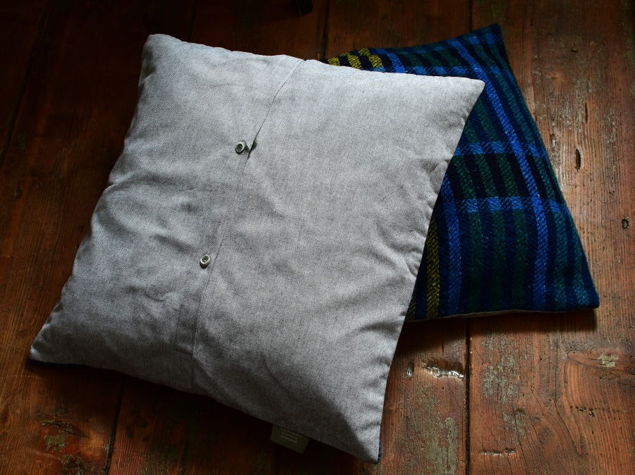 Přední strana polštářů je z ručně tkáné vlněné látky (keprová vazba, 100% merino)