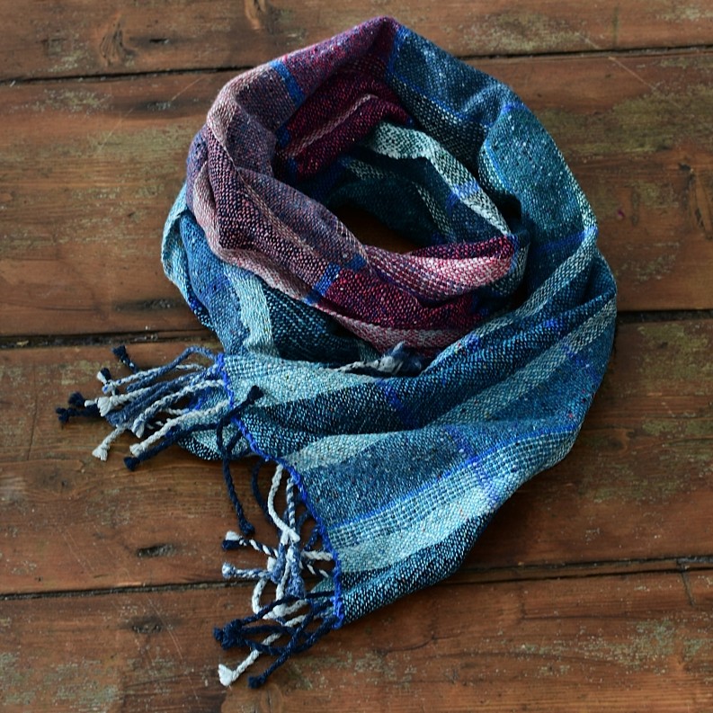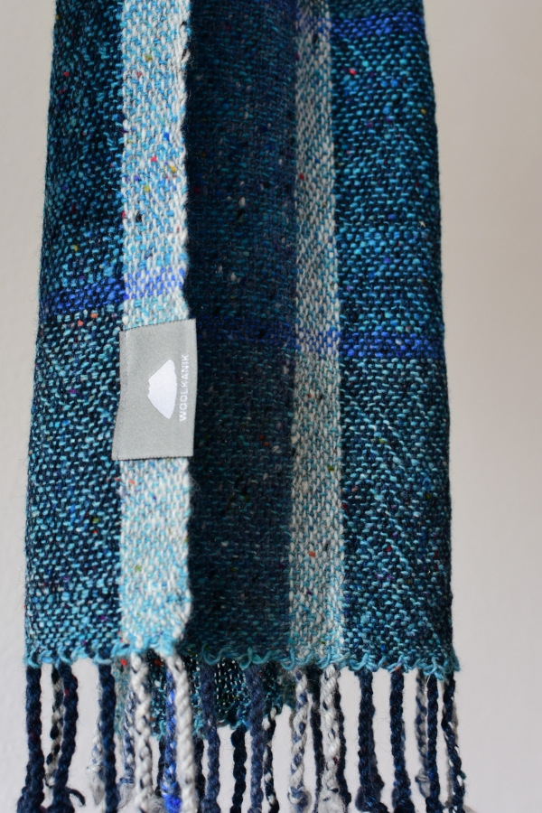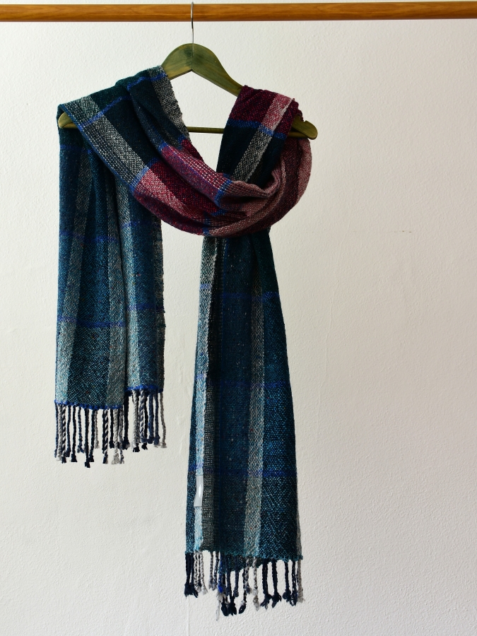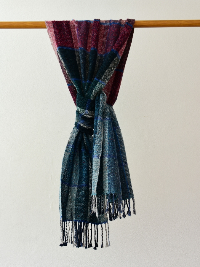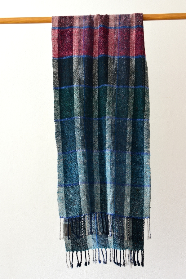 Made from Soft Donegal (100% merino wool), plain weave, variation on the log cabin pattern