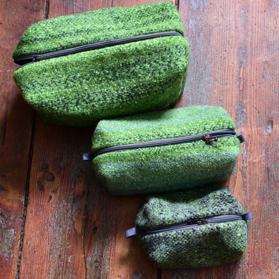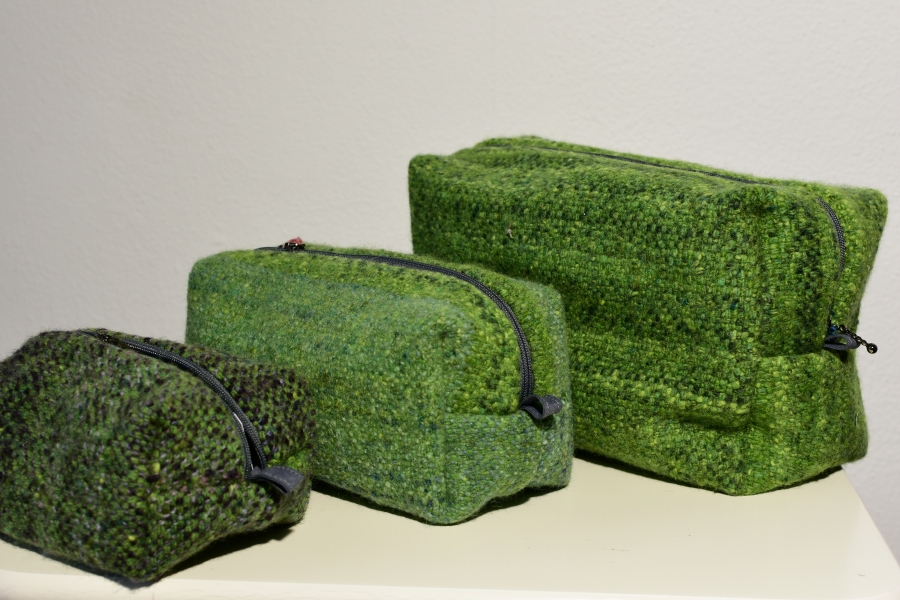 Se of boxy toiletry bags made of hand-woven woolen fabric, with zipper and a cotton lining inside.