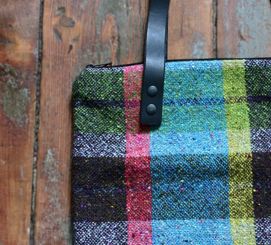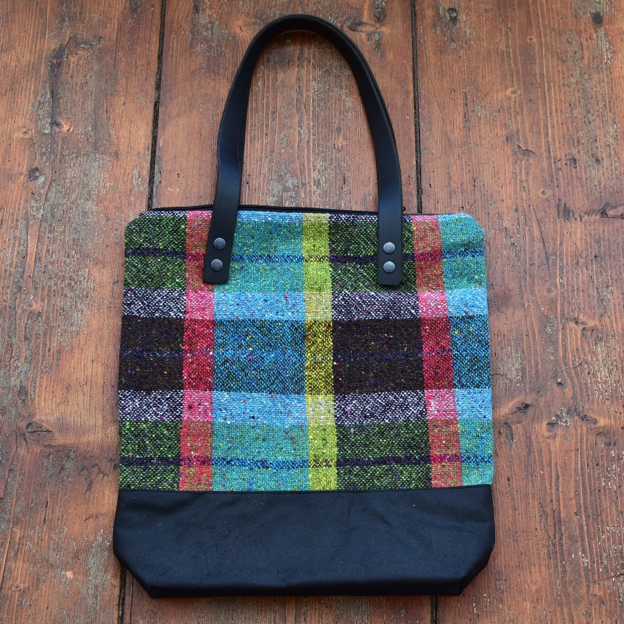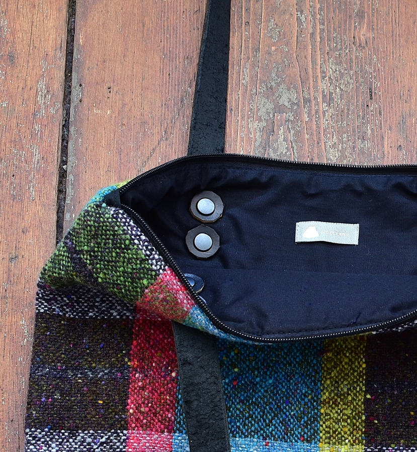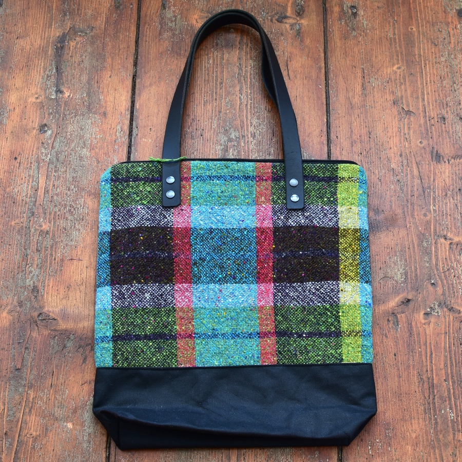Fabric: Soft Donegal yarn (100% merino wool), woven with a plain weave, bottom of the bag is made from waxed cotton